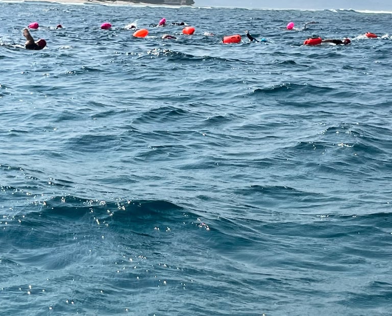 3 guided swims (approx 12km, 8km, 10km)
